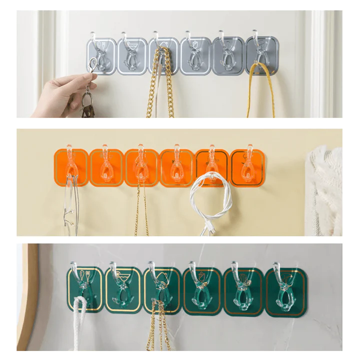 Wide Application This self-adhesive wall 6-hook is conveniently well-spaced so you can hang mini or bigger, bulky items without issues. Suitable for storing keys, belts, scarves, beanies, hats,umbrellas, robes, towels, loofahs, scrubber, brushes, kitchen utensils, coats, handbags, shopping bags, and more possibilities. Making it an ideal organizing hook rack for living room, kitchen, bathroom, bedroom, entryway, hallways, doors, walls, office, apartments, and such.
