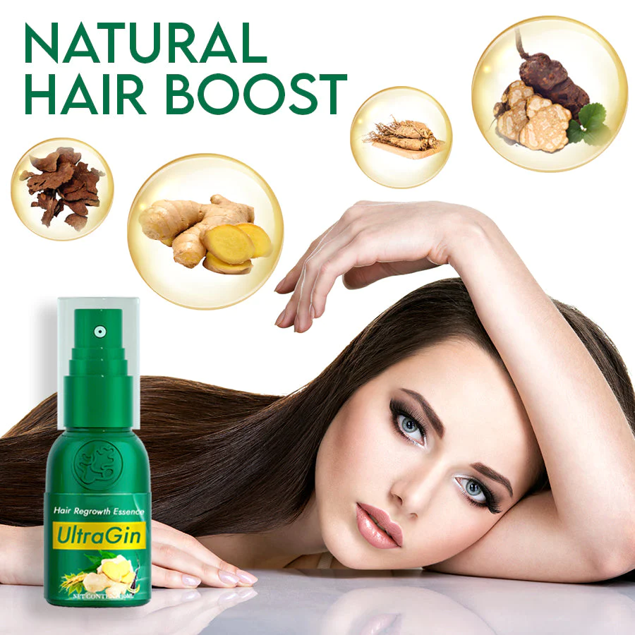 UltraGin Hair Regrowth Essence is a hair growth accelerator and preventer. UltraGin keeps the scalp healthy, strong and nourished. Powerful Ginger Extract penatrate deep into the hair follicles, stimulates enzyme activities, increases absorption of nutrients and restores balance to the damaged hair follicles. This balanced scalp environment allows for healthier, stronger and more resilient hair growth.