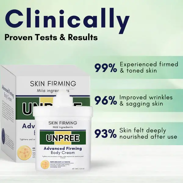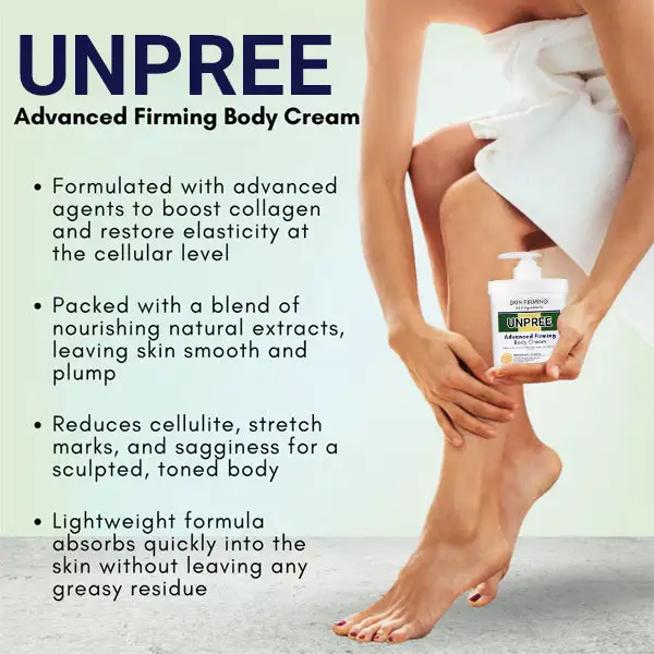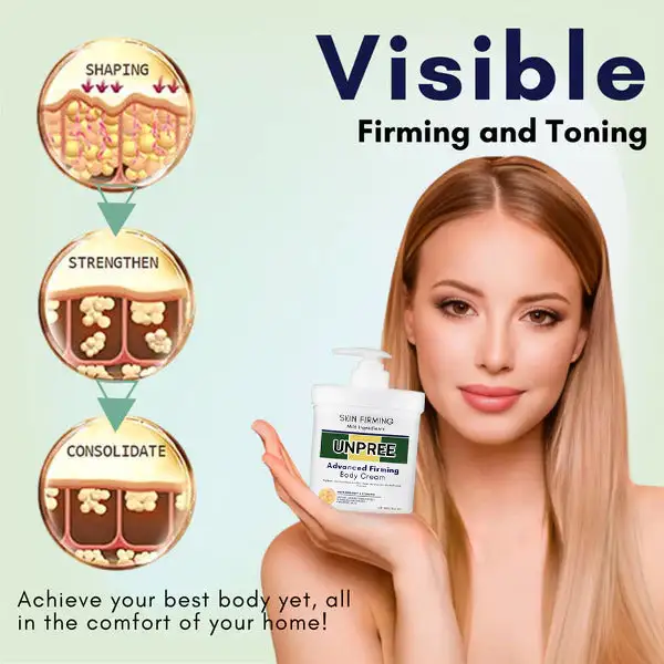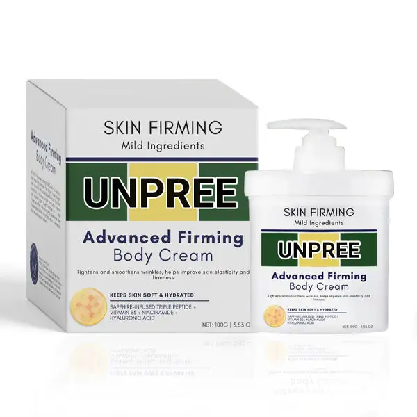 UNPREE™ Advanced Firming Body Cream utilizes an innovative transdermal method that delivers potent skin-firming ingredients deep into the skin layers to target areas susceptible to sagging, such as the breasts, buttocks, arms, and belly. This transdermal technology ensures that the powerful ingredients penetrate beyond the surface, addressing the root causes of skin sagging and laxity. The cream is formulated with cutting-edge firming agents that work synergistically to boost collagen production and enhance skin elasticity, helping to tighten and lift problem areas. By increasing collagen levels, the skin becomes firmer and more resilient, which helps reduce sagging and create a more sculpted, contoured appearance.