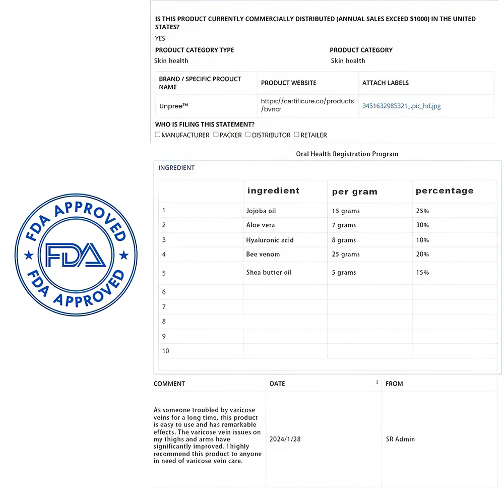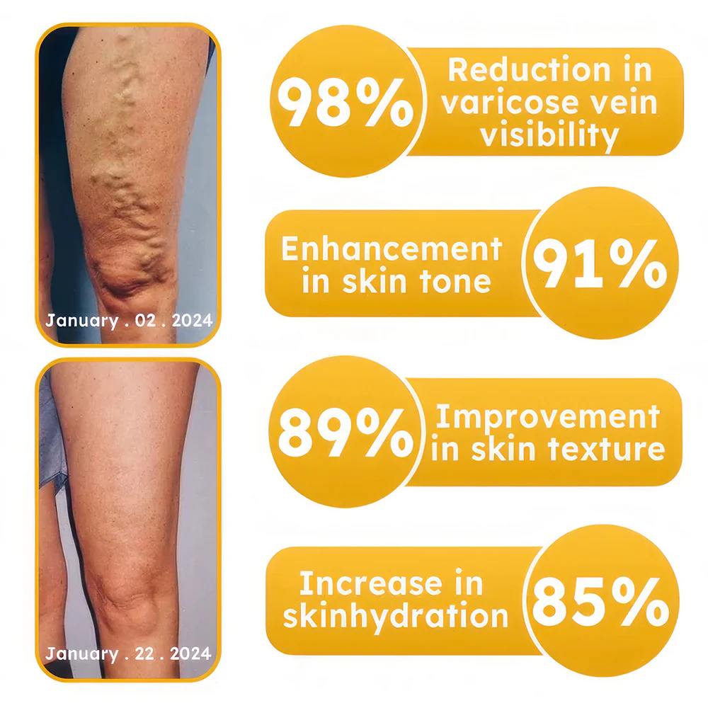 Dive into the evidence of Unpree™’s effectiveness through a comprehensive clinical study. With 100 participants applying Unpree™ Bee Venom Varicose Veins Cream or a placebo twice daily for 12 weeks, the results were nothing short of astounding. Witness the remarkable outcomes in the treatment group: an 98% reduction in the visibility of varicose veins, a 90% improvement in skin texture, a 91% brightening of skin tone, and an 89% increase in skin moisture compared to the control group. These groundbreaking findings solidify Unpree™ as a proven solution for enhancing varicose veins and boosting overall skin health.