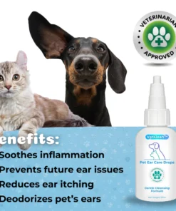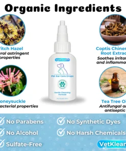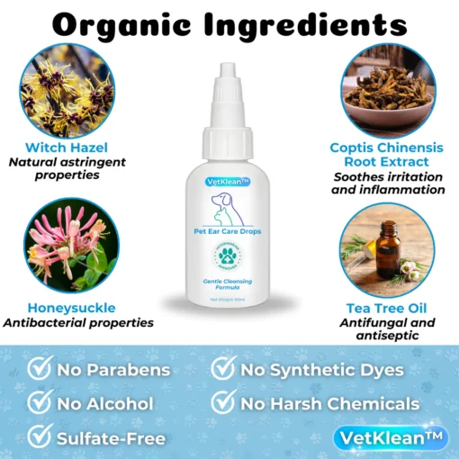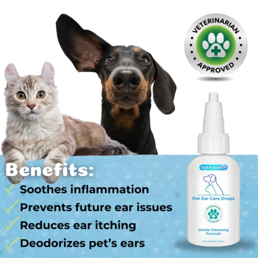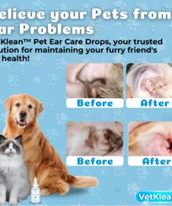 Introducing VetKlean™ Pet Ear Care Drops: the essential solution for maintaining your pet’s ear health. Formulated with care and expertise, VetKlean™ gently cleanses and protects your furry friend’s ears, ensuring optimal hygiene and preventing infections. Trust VetKlean™ for happy, healthy ears your pet deserves!