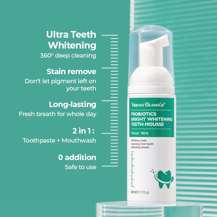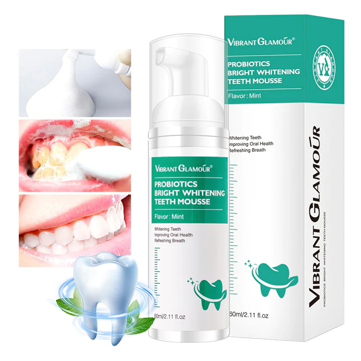 Revolutionize the way you clean your teeth with the Vibrant Glamour™ Probiotics Bright Whitening Teeth Mousse! The rich foam from our teeth whitening mousse cleans, whitens, and protects your teeth in a single step, keeping your smile dazzling and your mouth healthy.
