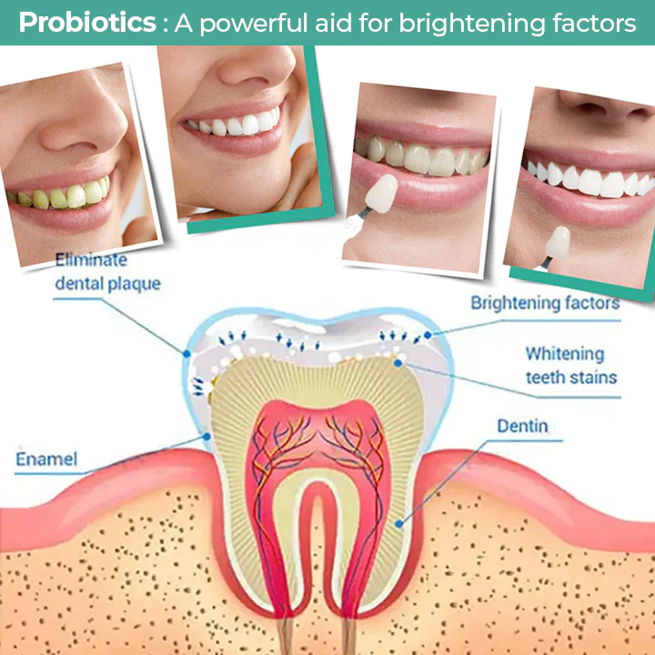 Years worth of food stains and plaque buildup lead to discolored or yellowing teeth. Using a low dose of probiotics can slow down the buildup of plaque and gently whiten the teeth without causing tooth sensitivity or gum irritation.
