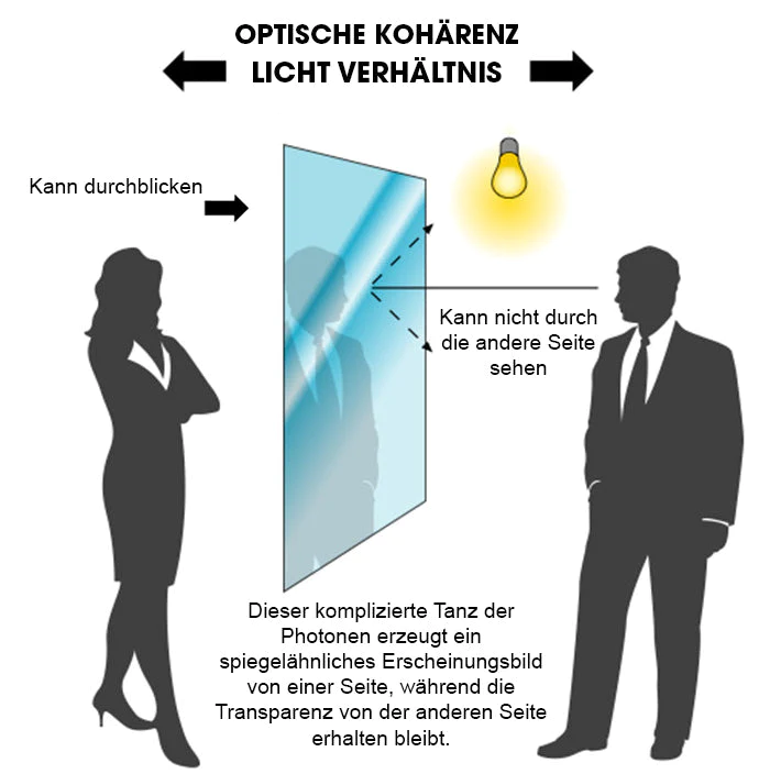 Optische Kohärenz: Der Schlüssel zu unserer Einwegspiegeltechnologie liegt in der optischen Kohärenz. Wenn Lichtphotonen mit der beschichteten Oberfläche interagieren, durchlaufen sie einen komplexen Prozess der Interferenz und Reflexion. Dieser komplizierte Tanz der Photonen erzeugt ein spiegelähnliches Erscheinungsbild von einer Seite, während die Transparenz von der anderen Seite erhalten bleibt..