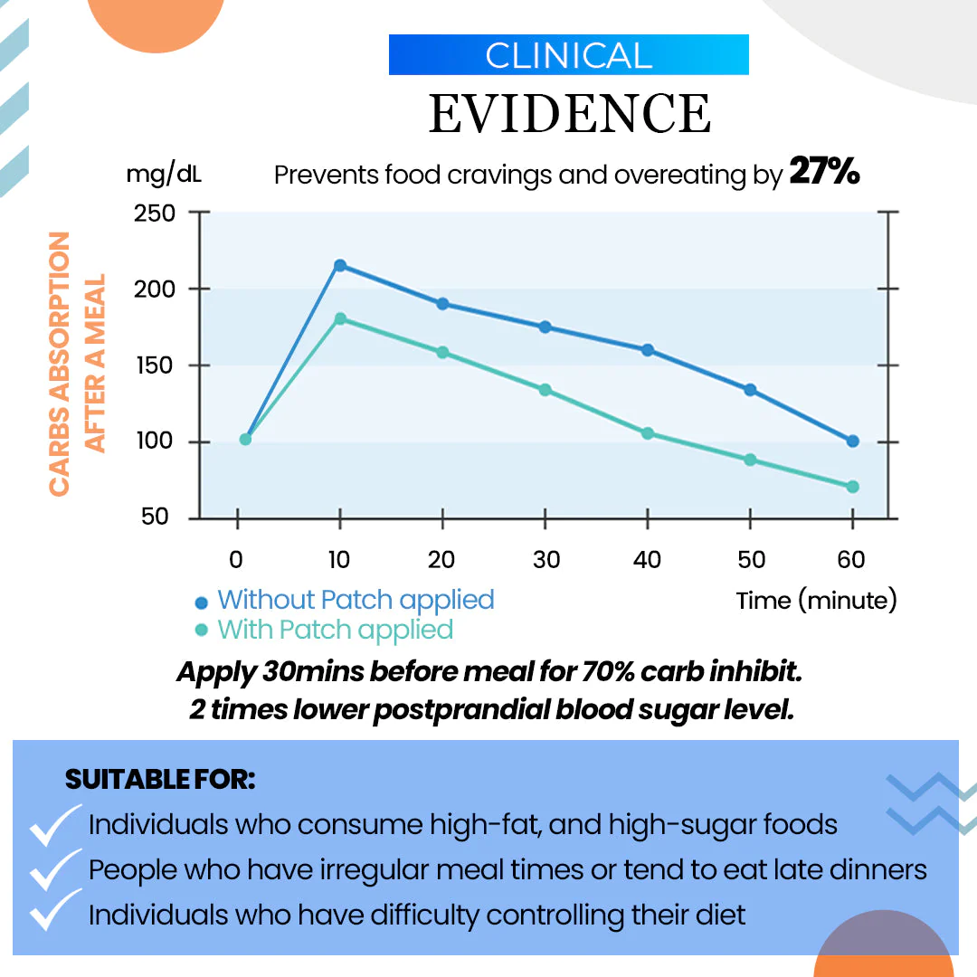 Moreover, the patch promotes blood circulation, improves the digestive system, reduces sugar absorption by 30%, and intercepts calorie absorption from starch. It’s a gentle and non-invasive solution for occasional digestive concerns.